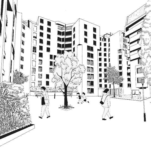 Ce projet cherche également à créer une identité à l’échelle de la résidence pour favoriser la lisibilité et les liens entre des immeubles hétéroclites