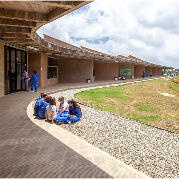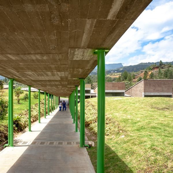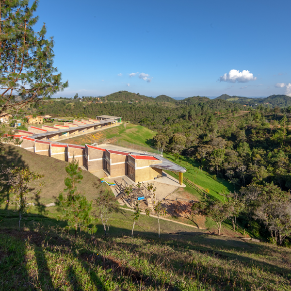 Positionnée au cœur de la montagne antioquena, l’école vient épouser la courbe de niveau pour s’ouvrir pleinement sur la vallée